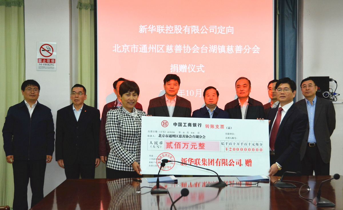 10月12日上午,新華聯集團向北京市通州區慈善協會臺湖鎮慈善分會捐贈儀式在臺湖鎮政府舉行。集團董事局主席兼總裁傅軍、通州區臺湖鎮黨委書記倪德才出席簽約儀式并分別致辭。