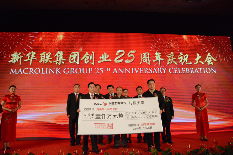 2015年10月28日,新華聯集團在成立25周年之際,向中國文化教育事業捐款5000萬元,其中1000萬元捐贈給湖南、青海、山東、寧夏等地的10所貧困中小學校,用于改善教學、辦公設施;1000萬元捐贈給毛澤東主席的母校——湖南第一師范學院,用于設立新華聯獎學金,每年幫助50名家庭困難且品學兼優的大學生完成學業;3000萬元捐助文化公益事業,用于弘揚中華文化,保護文化遺產。